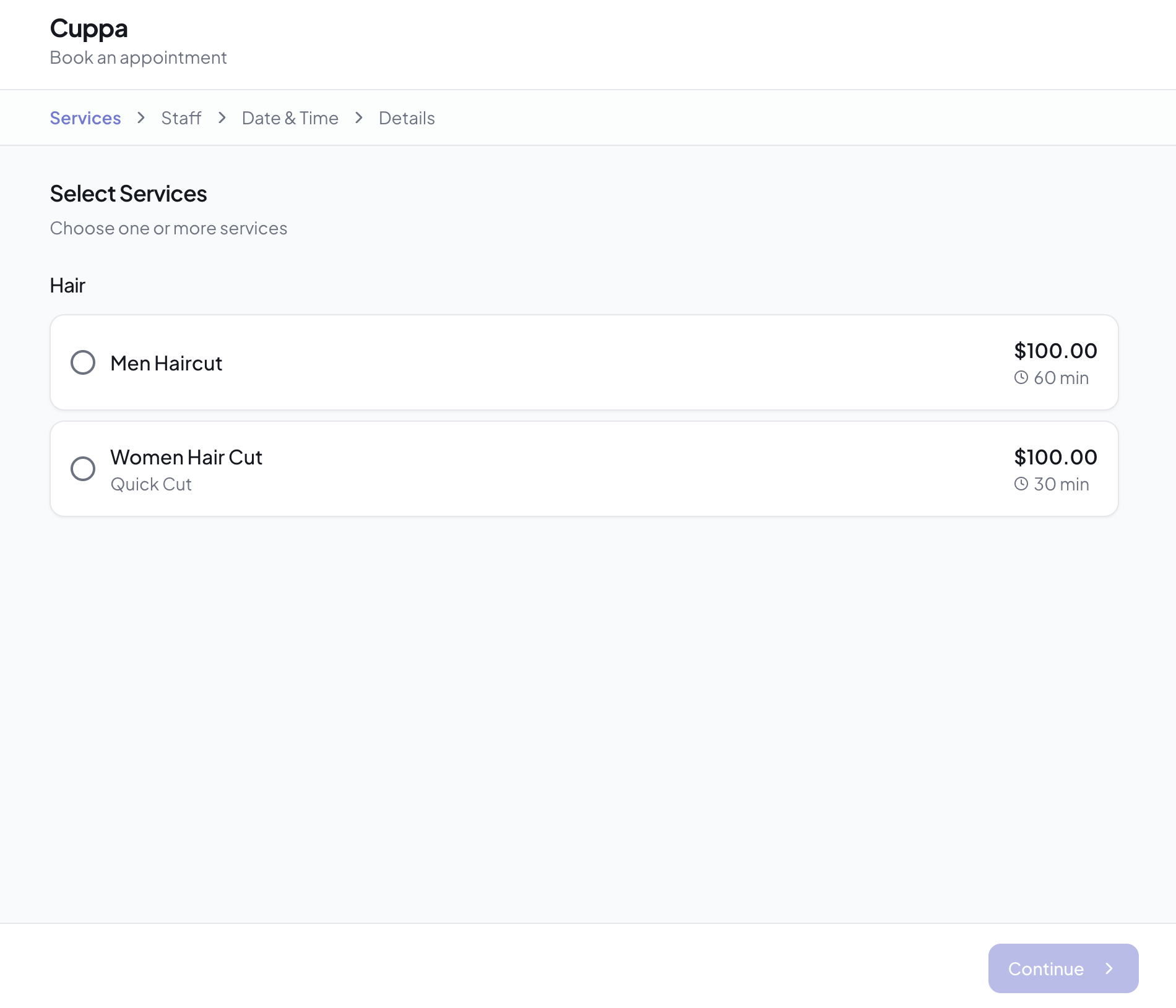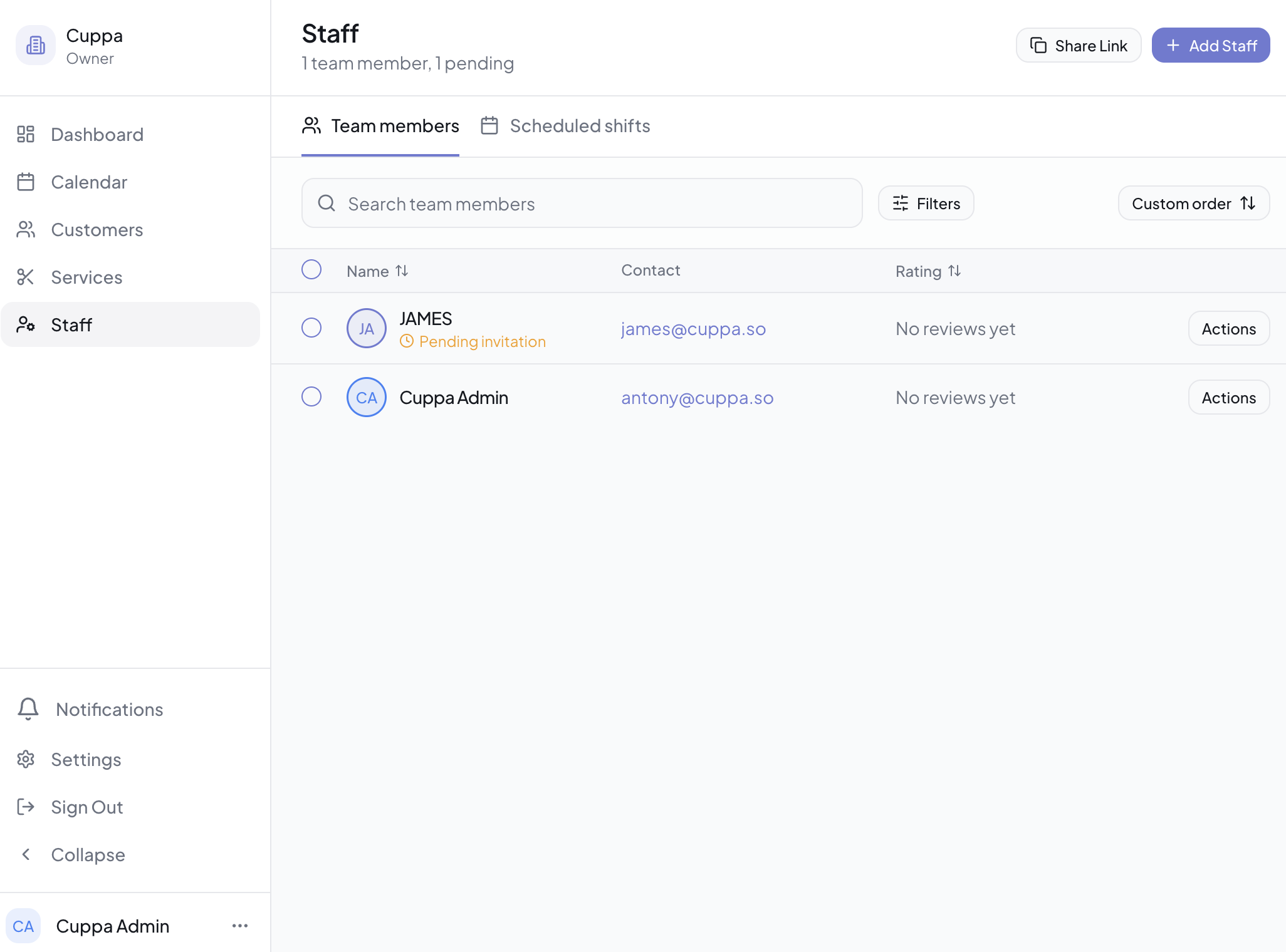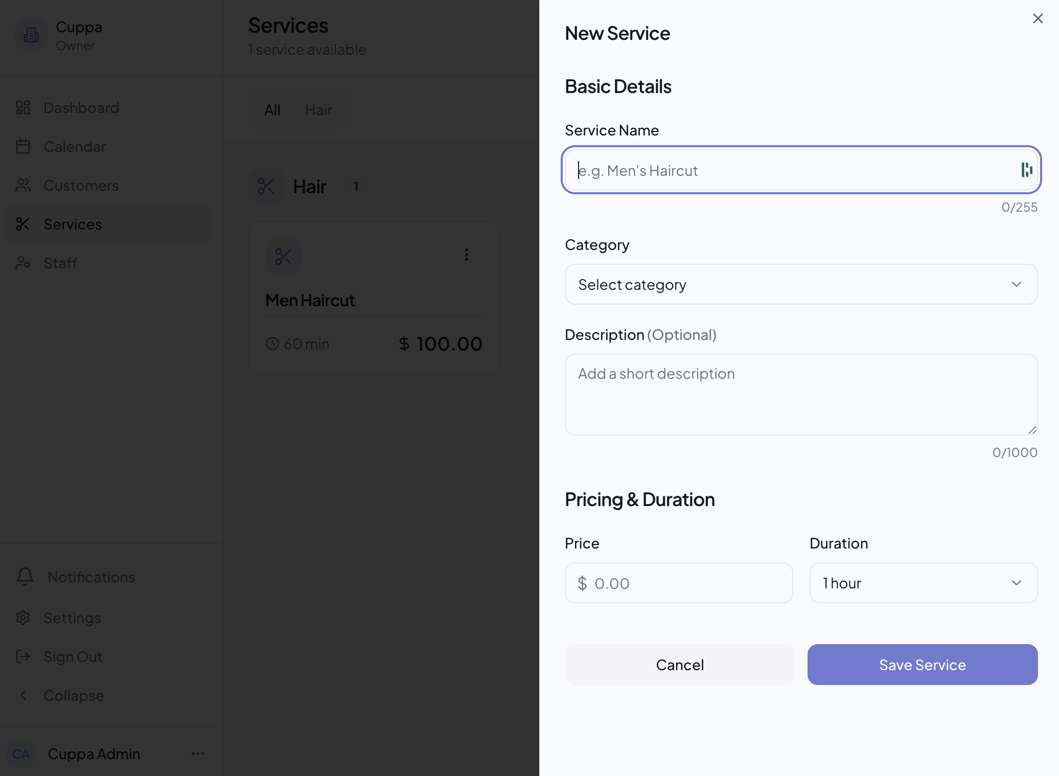 Cuppa is a simple online booking platform for salons, barbers, spas, fitness studios, health practices, tattoo shops, and other service businesses. It centralises appointments, services, and staff scheduling in one system.